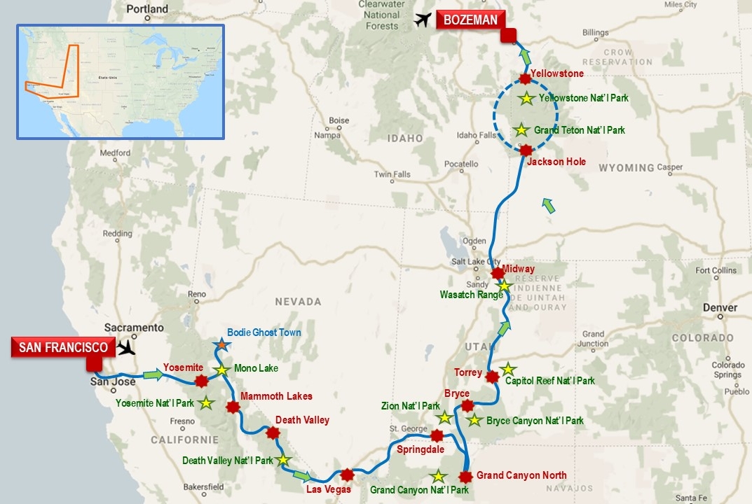 Au départ de San Francisco, sur les rives du Pacifique, en route pour une chevauchée fantastique à la découverte des grands parcs de l'Ouest : Yosemite puis Death Valley en Californie, avant une escale à Las Vegas au Nevada, puis un périple au cœur des sites incontournables de l'Utah et de l'Arizona : Zion, la rive nord du Grand Canyon, Bryce Canyon et ses 'hoodoos', Capitol Reef... Remontée vers les Rocheuses, dans le Wyoming, pour y découvrir les parcs nationaux de Grand Teton et de Yellowstone! Fin du voyage à Bozeman au Montana.