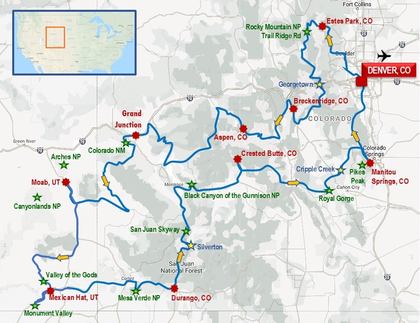 Au départ de Denver, cap sur la Trail Ridge Rd, la plus haute route du pays! Après le Guanella Pass, Breckenridge et Aspen, direction l'Utah et le Colorado Nat'l Monument, avant les fabuleux parcs nationaux d'Arches et Canyonlands. Suivent Monument Valley, Mesa Verde et ses habitations troglodytiques, puis la San Juan Skyway au départ de Durango. Après le Black Canyon of the Gunnison, place aux 156 virages de Pikes Peak. Fin à Denver. Un itinéraire coup de cœur.