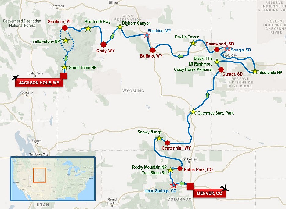 Au départ de Denver, cap sur les Rocheuses, à travers les grands espaces du Colorado, du Dakota du Sud, du Wyoming et du Montana, jusqu'au fabuleux parc national de Yellowstone! Après la Trail Ridge Rd, dans le Rocky Mountain National Park, cap sur les Snowy Range puis les Black Hills, avant les Badlands, le Mt Rushmore, puis Deadwood et Sturgis, la Mecque des motards. Devils Tower, le Bighorn Canyon, Yellowstone & Grand Teton clôturent ce fabuleux itinéraire. Fin du circuit moto à Jackson Hole.