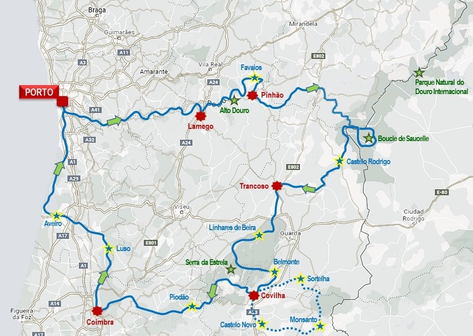 Au départ de Porto, cap sur le Douro, avec ses collines, ses vignobles à perte de vue, et ses 'miradouros' avec balançoire pour mieux admirer la vue. Place à la belle et sauvage région du Parque Natural do Douro Internacional, avec une incursion côté espagnol. Route vers les villages historiques de Trancoso, Belmonte, Sortelha, Monsanto, Piodão... Vous traverserez le massif de l'Estrela, seule chaîne de montagnes du Portugal, avec des routes et des vues à couper le souffle! Pause dans la splendide ville de Coimbra puis retour vers Porto. Itinéraire en liberté. dates de départ au choix. Moto ou voiture (prix voiture sur demande).