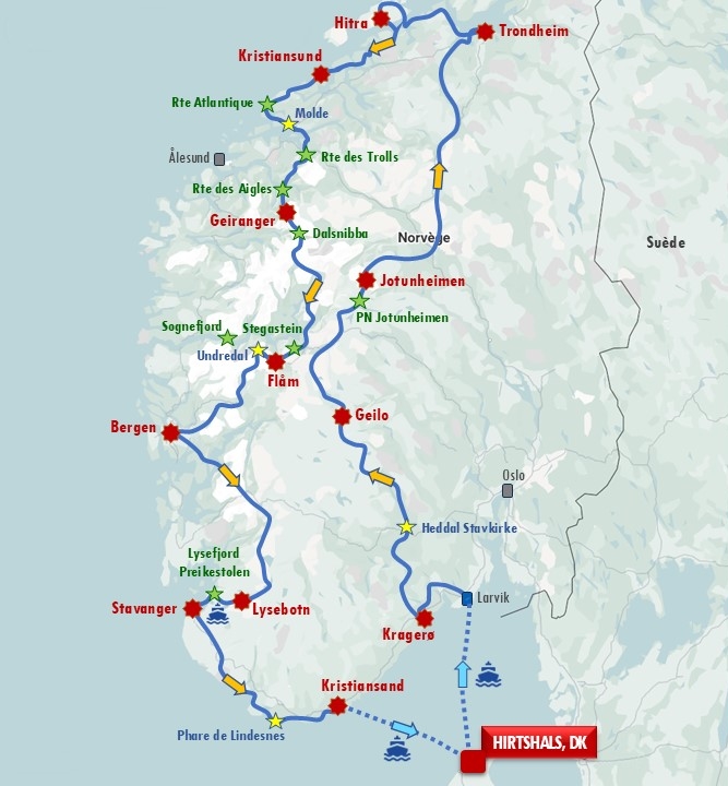 Un périple magique de 2.600 km, au départ de Hirtshals au Danemark. Après une traversée en ferry vers Larvik, route vers Kragerø sur la Riviera norvégienne. Cap ensuite sur Geilo, via la superbe Stavkirke de Heddal, avant la traversée du parc national de Jotunheimen, en altitude. Arrivée à Trondheim, porte d'entrée à la Norvège septentrionale, avec son beau quartier historique et sa cathédrale de Nidaros. Vous voici sur la sublime côte atlantique, découpée et sauvage. Après l'île de Hitra, route vers Kristiansund, avant de survoler littéralement l'océan par les impressionnants ponts de la Route Atlantique.