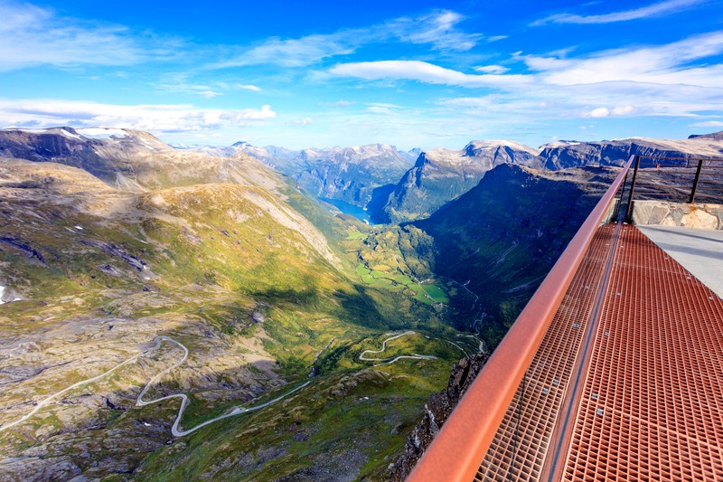 L'itinéraire serpente sur hauts plateaux, après un magnifique point de vue sur les gorges du Flydal, Geiranger et son fjord. Cap sur la plateforme d'observation du Dalsnibba, à 1.476m. La route qui y mène est payante. Le panorama est exceptionnel, et vous l’apprécierez d'autant mieux depuis le ‘Geiranger Skywalk’.