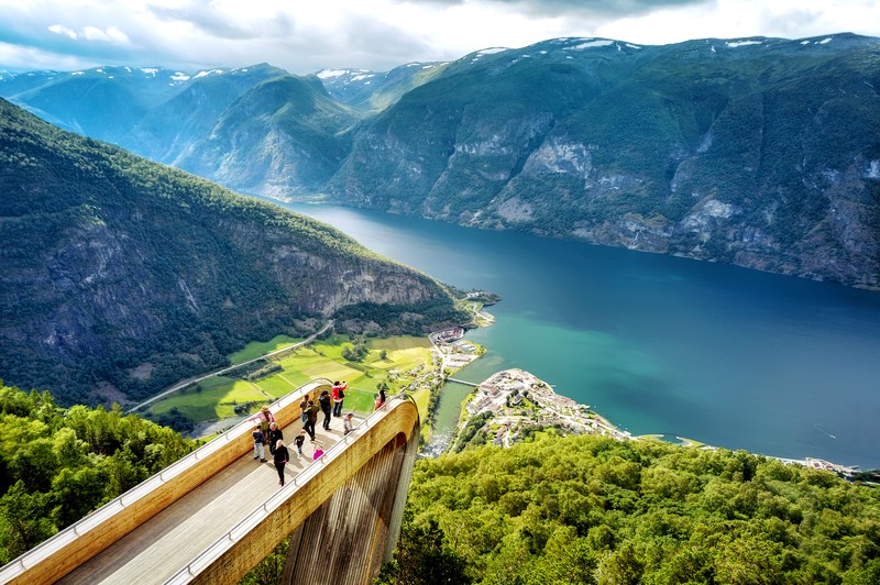 Vous empruntez la belle route panoramique Bjorgavegen, qui traverse une zone de landes pierreuses (la neige n'y est pas rare, même en été). Après le Stegastein, un splendide point de vue sur l'Aurlandsfjord, vous redescendez sur Aurland puis Flåm.