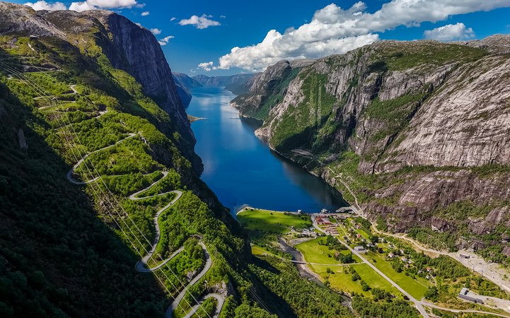 Bienvenue dans un autre comté, celui de Rogaland. Après quelques belles vues sur le lac Tjodanpollen, vous rejoignez le sommet de la magnifique Lysevegen, une route incroyable qui déroule ses 27 lacets en épingle, jusqu'à l'arrivée au bord du très photogénique Lysefjord. C'est l'un de nos endroits préférés en Norvège!