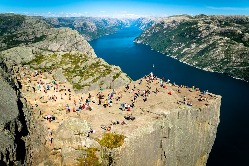 Depuis le parking et l'hôtel, vous pourrez entamer une belle marche de 2h, sur un dénivelé de plus de 300m, avant d'atteindre le rocher. A l’arrivée, un balcon naturel à pic qui surplombe le Lysefjord, dont les eaux scintillent 600m en contrebas. Vertigineux!