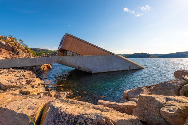 La trace vous mène jusqu'à un autre lieu unique, le restaurant Under. A moitié englouti dans la mer, c’est un vaisseau de béton long de 34m, volontairement naufragé pour reposer sur le fond marin. Colonisé par les algues, mollusques et autres crustacés, l'endroit abrite un restaurant étoilé, sous l’eau. Allez prendre un verre au bar.