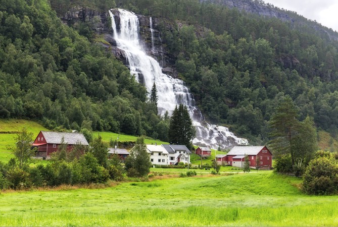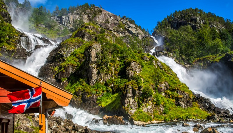Après une traversée en ferry entre Tørvikbygd et Jondal (env. 20'), la trace vous amène aux très impressionnantes et photogéniques chutes jumelles Låtefossen.